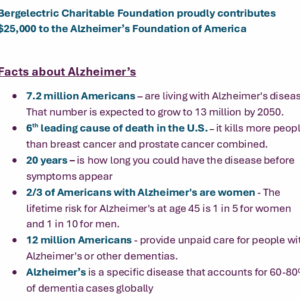 The Bergelectric Charitable Foundation made a $25,000 donation to the Alzheimer’s Foundation of America in support of the foundation’s mission to provide care, education, and resources to those affected by Alzheimer’s disease.