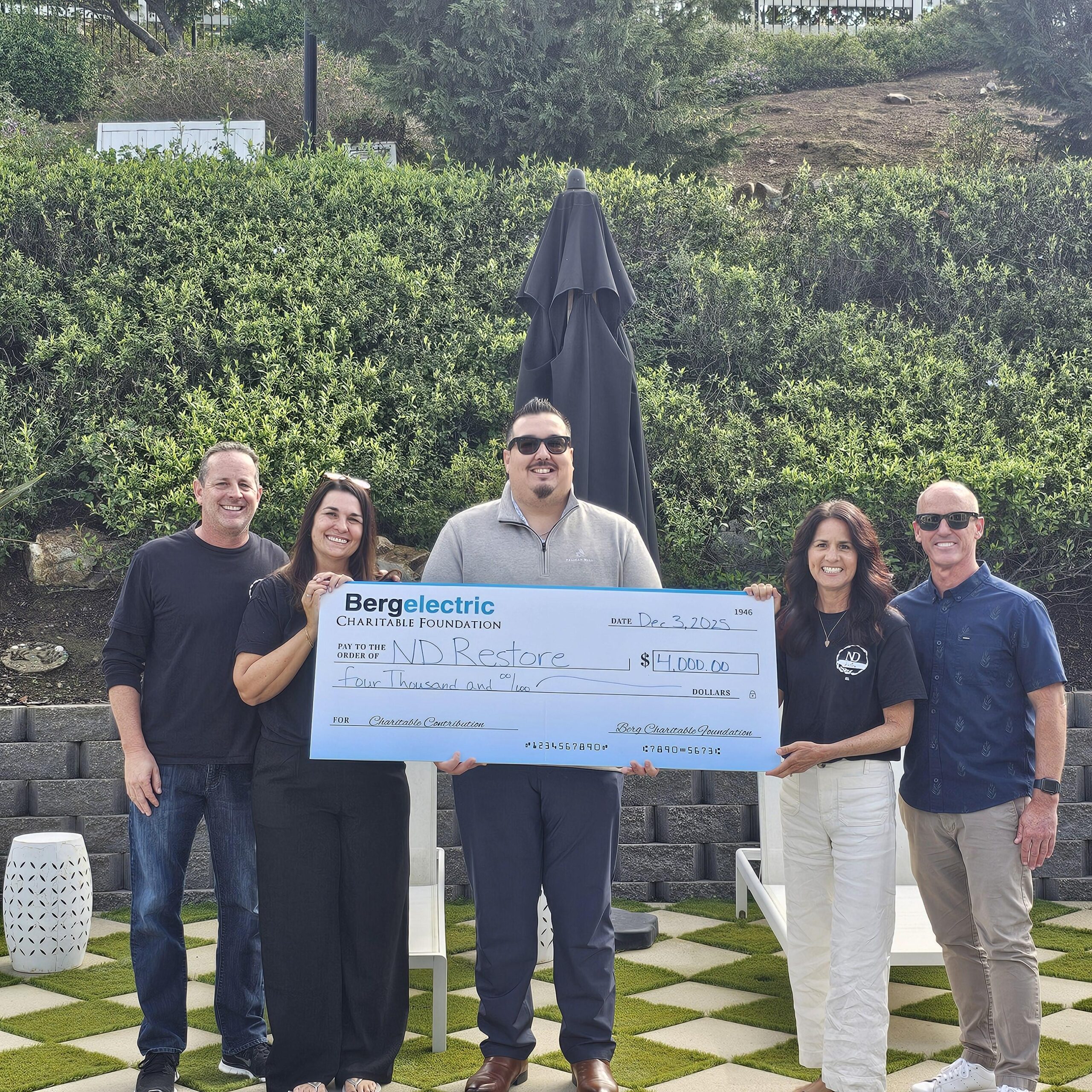 On Wednesday, December 3, 2025, Bergelectric’s San Diego, National, NTS, and Underground Regions joined forces to make a significant difference in their local community, presenting a $4,000 discretionary funds disbursement to ND Restore in Vista, California.